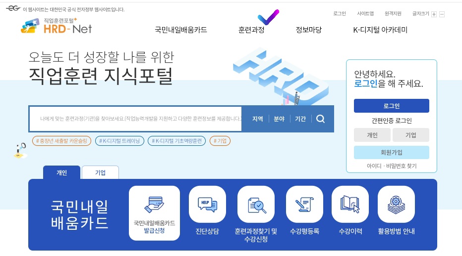 위 사용처에서 사용하시려면 먼저 내일배음카드를 구매하셔야 합니다. 발급은 내일배움카드 HDR-Net 홈페이지에서 가능합니다.