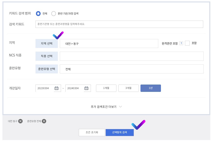 3) 교육을 받고자 하는 지역을 선택하고 (직종) (교육유형) (개강일)을 선택한 후 (선택 항목 보기)를 클릭합니다. 더 자세히 검색하고 싶으시면 (추가검색조건 더보기)을 클릭 후 입력하세요.