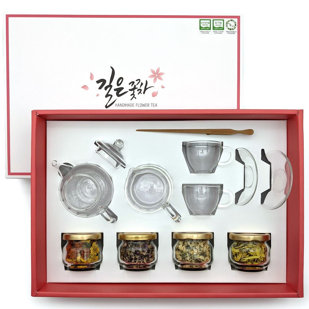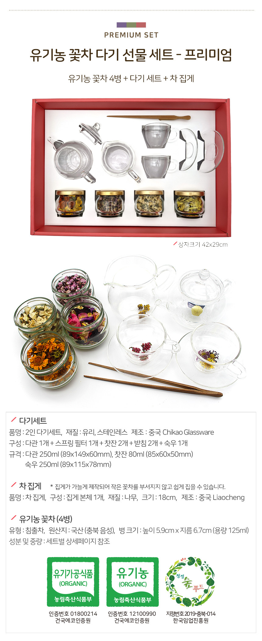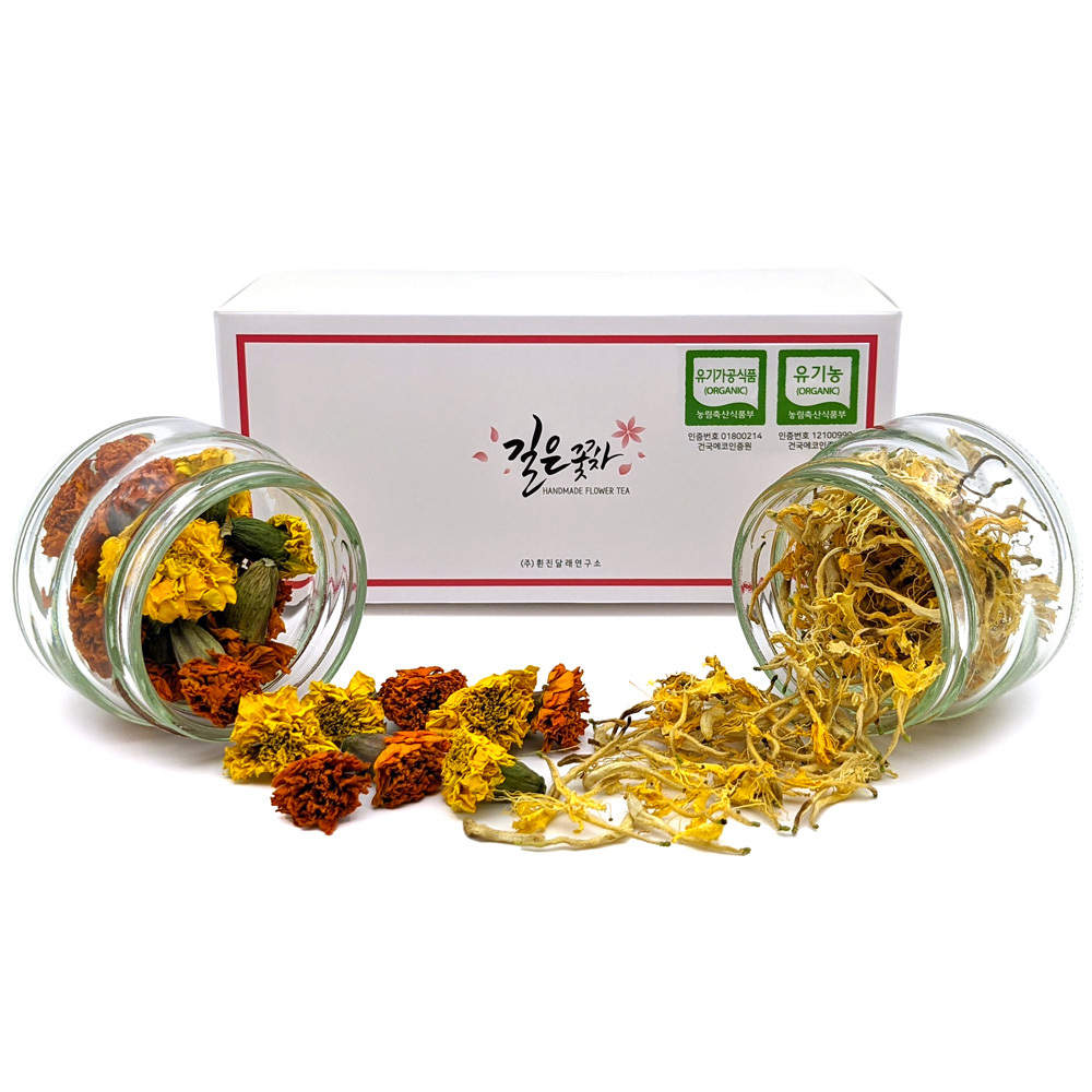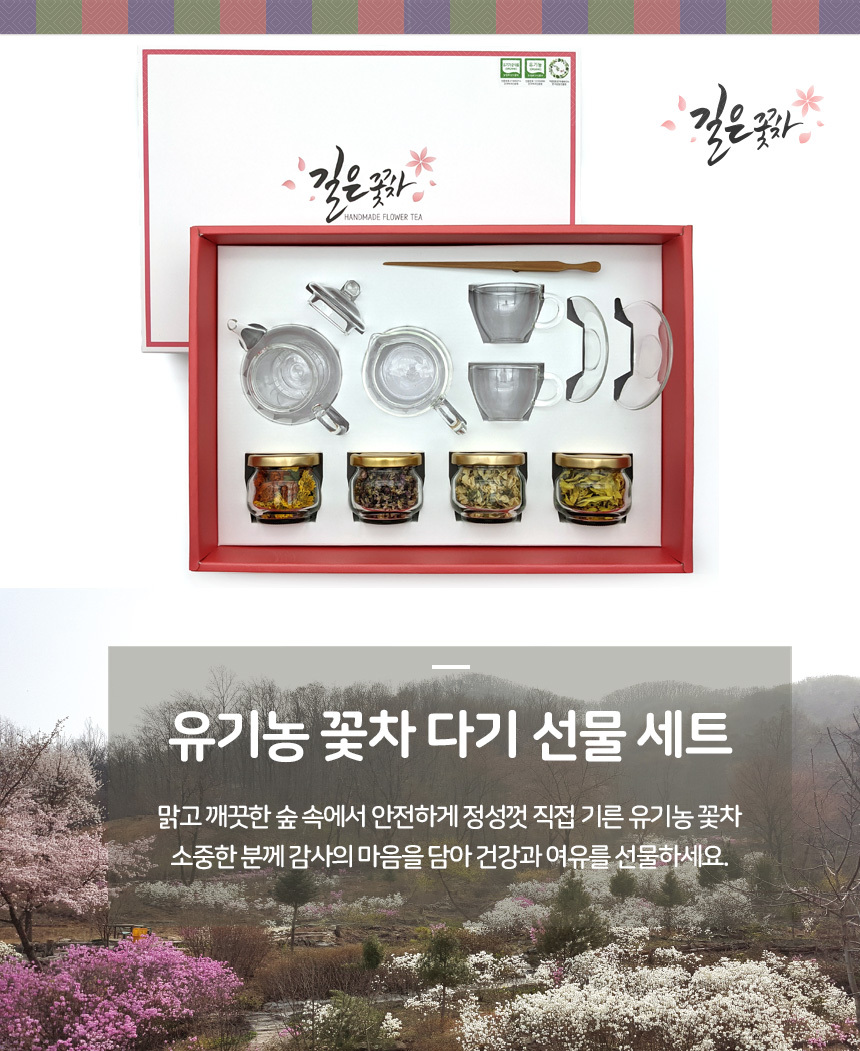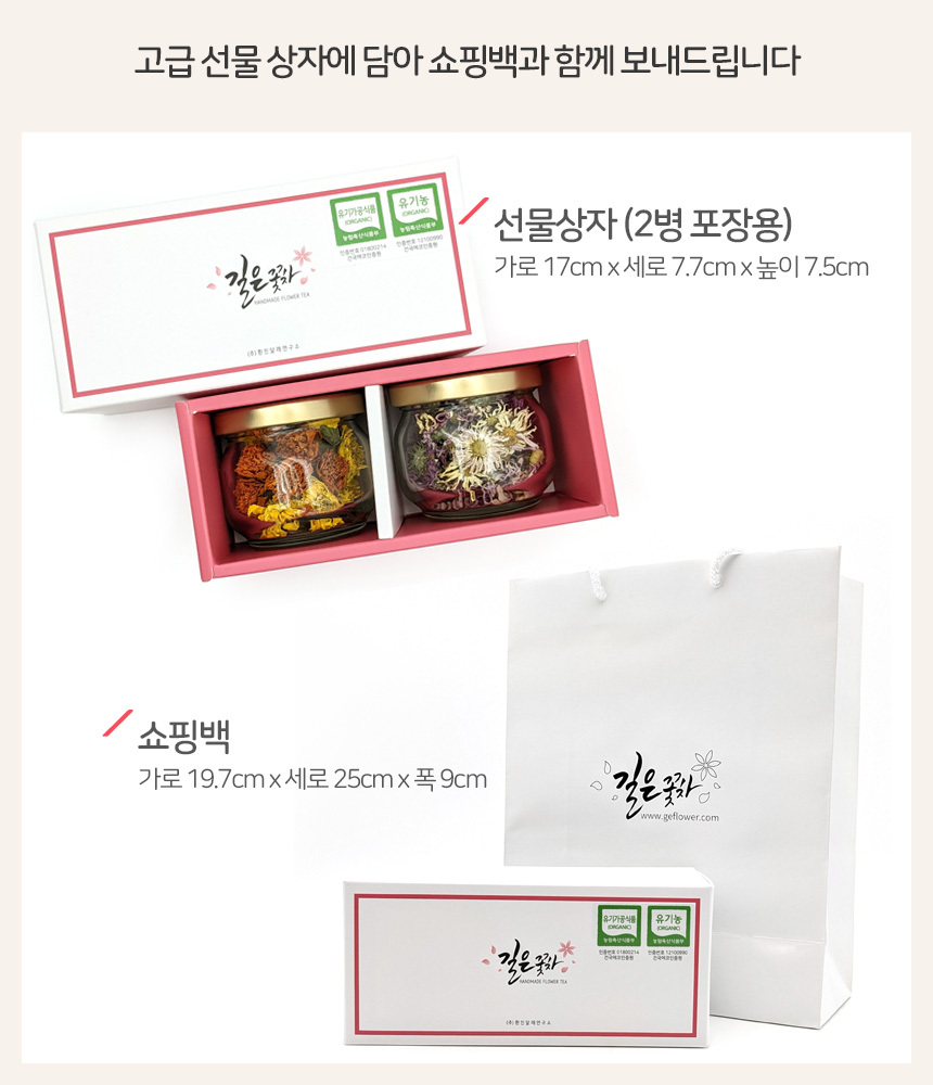 소중한 분들께 특별한 선물 자연의 건강함을 듬뿍 담은 꽃차와 함께 오늘도 꽃길만 걸어보세요~ 3종의 꽃 원산지는 충북 음성 국산 제품으로 유기농 인증을 받은 제품입니다.
