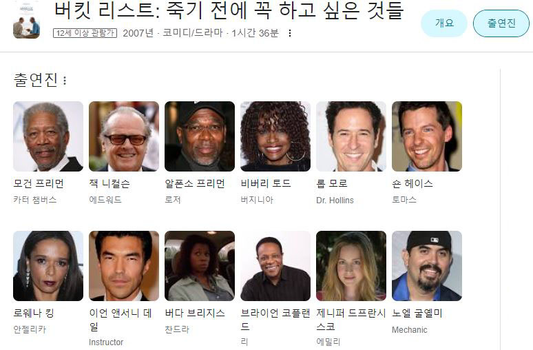 출연 잭 니콜슨, 모건 프리먼, 숀 헤이즈, 베벌리 토드