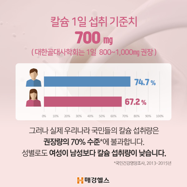 이는 남성에게도 문제가 되지만, 여성은 출산 후 갑자기 칼슘 결핍을 겪는다. 출생 시 골밀도가 감소하기 시작하면서 칼슘의 배설량이 점차 흡수량보다 높아지게 됩니다. 50대 폐경 이후에는 다양한 요인으로 인해 골밀도가 크게 감소하여 골절이 발생하기 쉽고 강직이 발생하게 됩니다. 그렇기 때문에 사전에 칼슘을 보충해 주는 것이 필요합니다. 이때 단순히 칼슘만 먹기보다는 성분을 꼼꼼히 살펴봐야 한다. 칼슘은 섭취량에 비해 흡수율이 낮다는 맹점이 있기 때문이다.