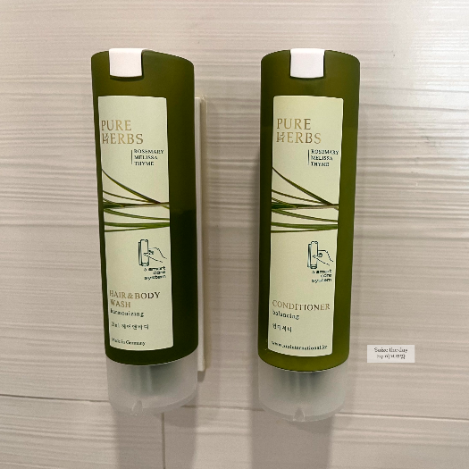 Pure Herbs라는 브랜드의 리필 가능한 샴푸/바디/로션이 벽에 걸려 있었습니다.