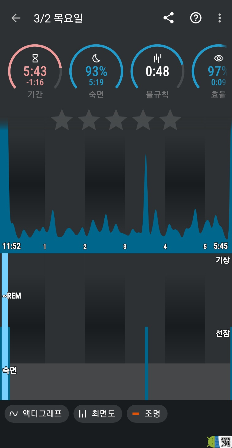 – 수면상태 : 취침시간 11시 52분 / 기상시간 5시 45분 / 수면시간 5시 43분 / 건강한 수면율 93% / 수면효율 97%