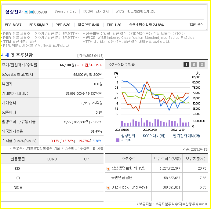 삼성전자의 현재 주가는 66,100원으로 전일 대비 -3.78원이다. 삼성전자의 주주현황을 보면 삼성생명(외 15개사)이 20.73%의 지분을 보유하고 있다. 삼성전자는 반도체 및 관련 장비업체로 장중 주가는 6만6100원이다. 삼성전자의 시가총액은 388조 6328억원이며 발행주식수는 5149주이다. 외국인 보유고는 15,091,022%, 일중 거래량은 5,969,782,550을 기록했다. 매출은 3조 022조 3,140억원, 영업이익은 51조 6,339억원을 달성하였습니다. EPS는 1,702원, 삼성전자 주식 배당수익률은 2.61%다.