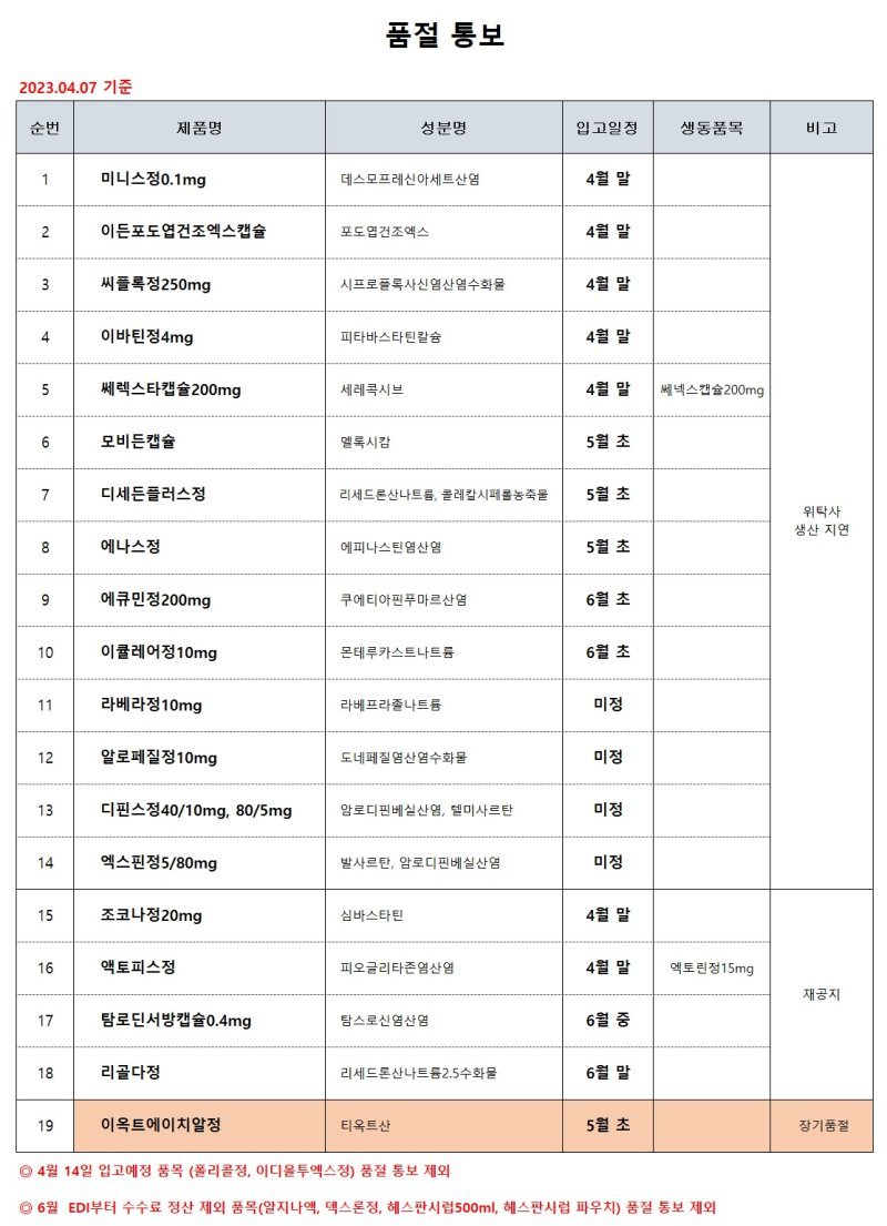 (영일제약) 일시 품절 의약품 배송 일정 안내
